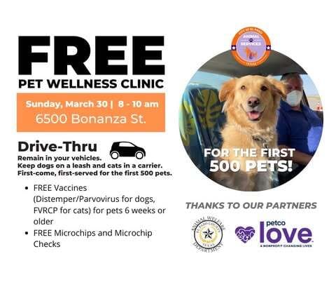 Head over to El Paso's free Drive-Thru Pet Wellness Clinic this Sunday! The first 500 pets get free vaccinations and microchips from 8-10 a.m. at 6500 Bonanza St. Itโs first come, first served. Celebrate National Pet Vaccination Month by keeping your furry friends safe and happy! Donโt miss out on spoiling your pet!