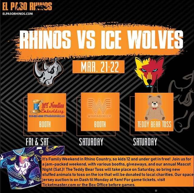 This weekend is Family weekend with the Rhinos so kids 12 and under get in free. Saturday will also include the popular teddy bear toss where fans can toss bears onto the ice after the game to then be collected and donated to local charities.