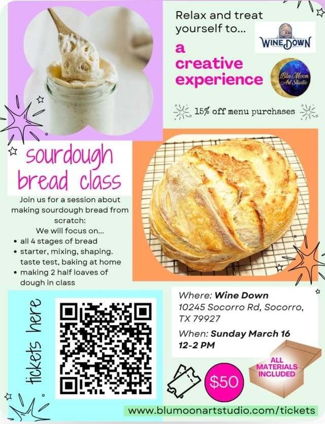 Learn the art of sourdough breadmaking in a fun, hands-on class at Wine Down Socorro! You'll craft two loaves, get a live starter, and taste-test fresh bread. You’ll leave with all the tools and skills to bake at home, plus, get 15% off food and drinks! Get your ticket here.