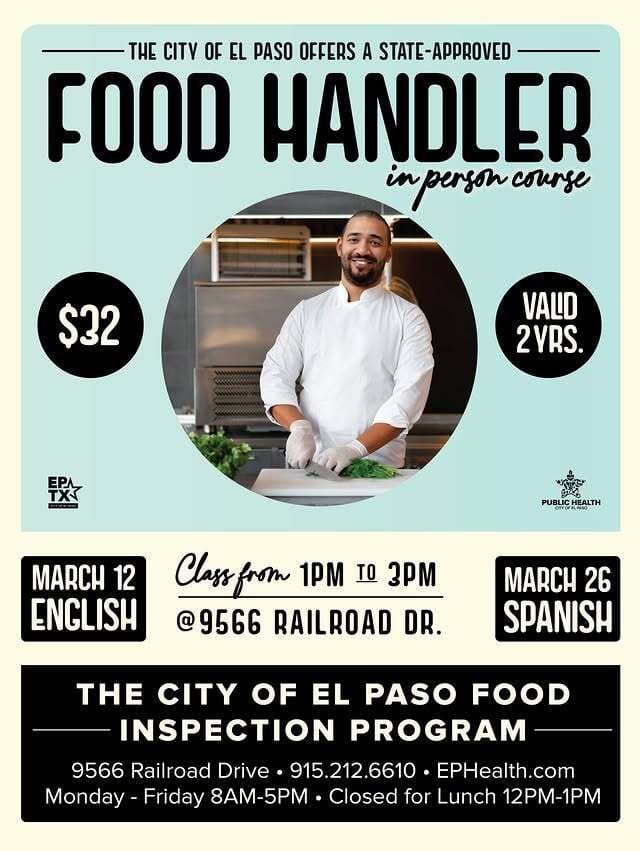 Get certified to serve safely with the City of El Paso’s Food Handler courses! For just $32, you can join in-person classes and learn how to keep your customers safe. The English class is on March 12, and the Spanish class is on March 26, both from 1:00 P.M. to 3:00 P.M.