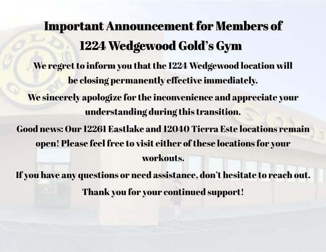 Gold’s Gym has announced that the 1224 Wedgewood location is closing permanently. But don’t worry! You can still work out at the Eastlake and Tierra Este locations.