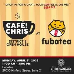 Stop by Fubatea for boba and a chat with City Rep. Chris Canales! No speeches, no stress—just open office vibes.
